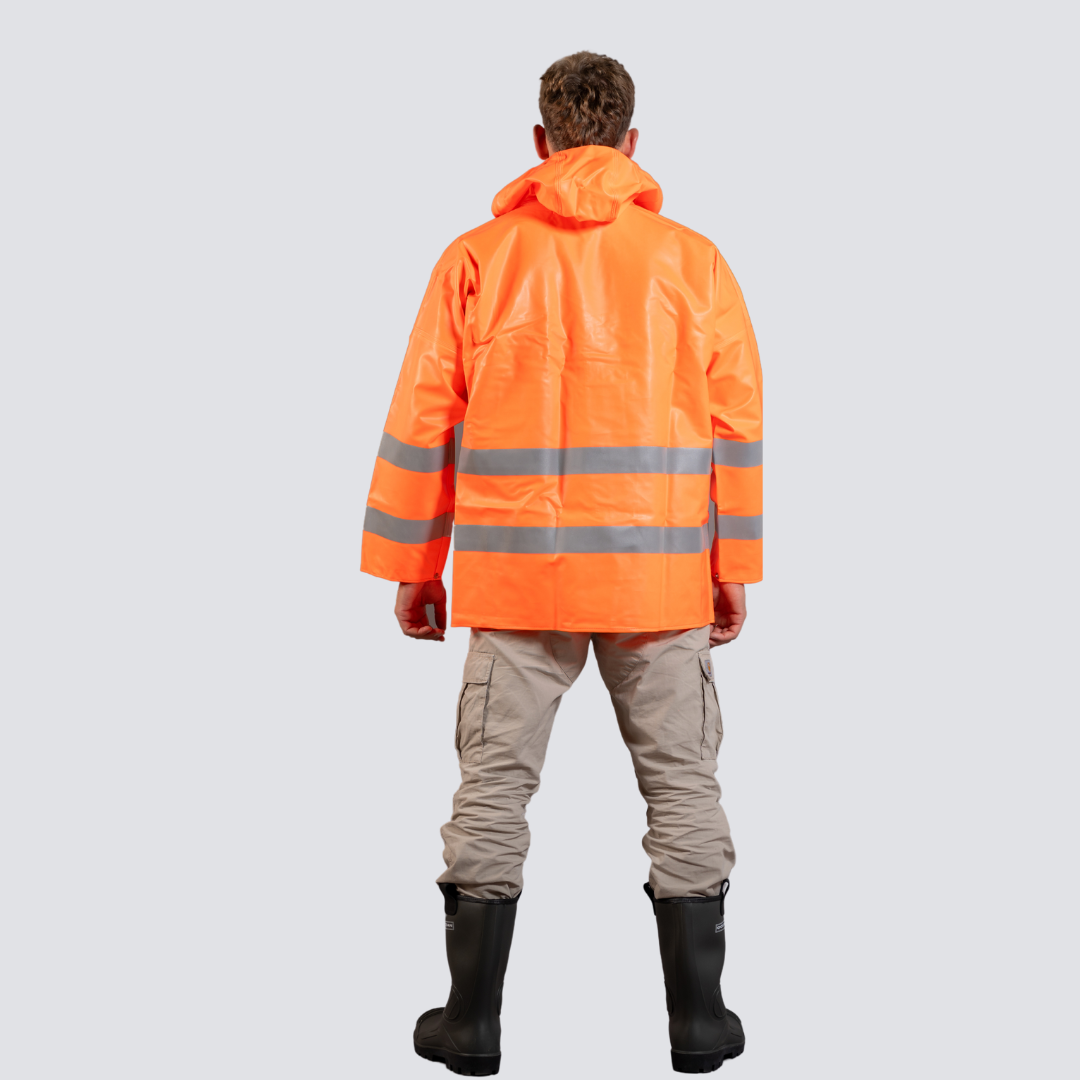 Die PVC-Jacke Offshore High Vis von OCEAN ist eine Regenjacke, die schwer entflammbar und resistent gegen Fette und Öle ist. Sie ist aus einem flexiblen und kältebeständigen Material hergestellt. Die Jacke wird mit einem Reißverschluss geschlossen, der auch Knöpfe und eine Frontleiste hat. Sie hat eine locker sitzende Komfortkapuze mit innenliegendem Kordelzug und die Ärmel sind mit Druckknöpfen zur Weitenregulierung versehen. Diese Arbeits-Regenjacke ist eine High Vis Jacke, das heißt, sie ist mit mehreren Reflektoren ausgestattet, um eine hohe Sichtbarkeit zu gewährleisten.
