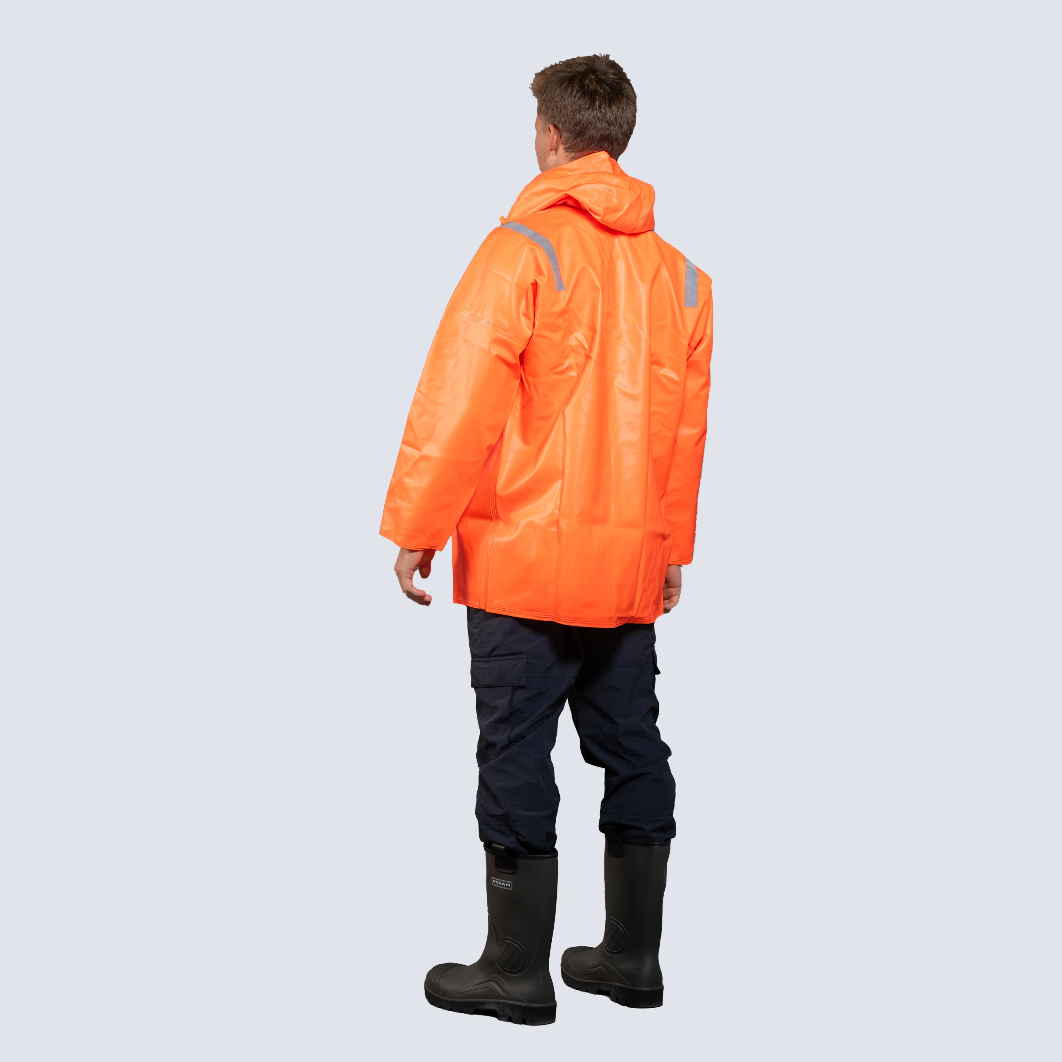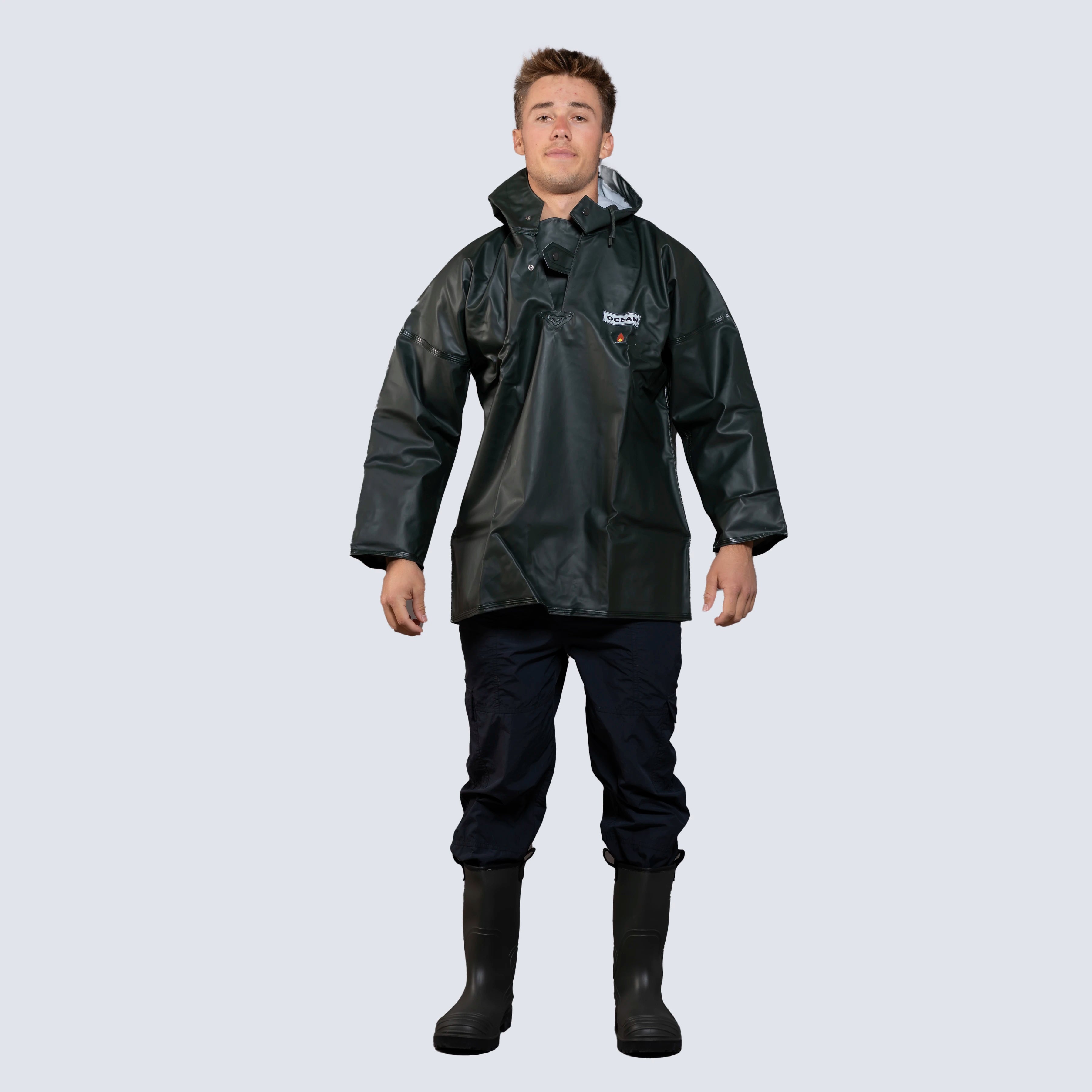 Hurricane Bus-Säulen von OCEAN scheint eine robuste und schützende Regenjacke zu sein, die für anspruchsvolle Arbeitsbedingungen ausgelegt ist, einschließlich kalter Umgebungen und der Gefahr von Flammen.
