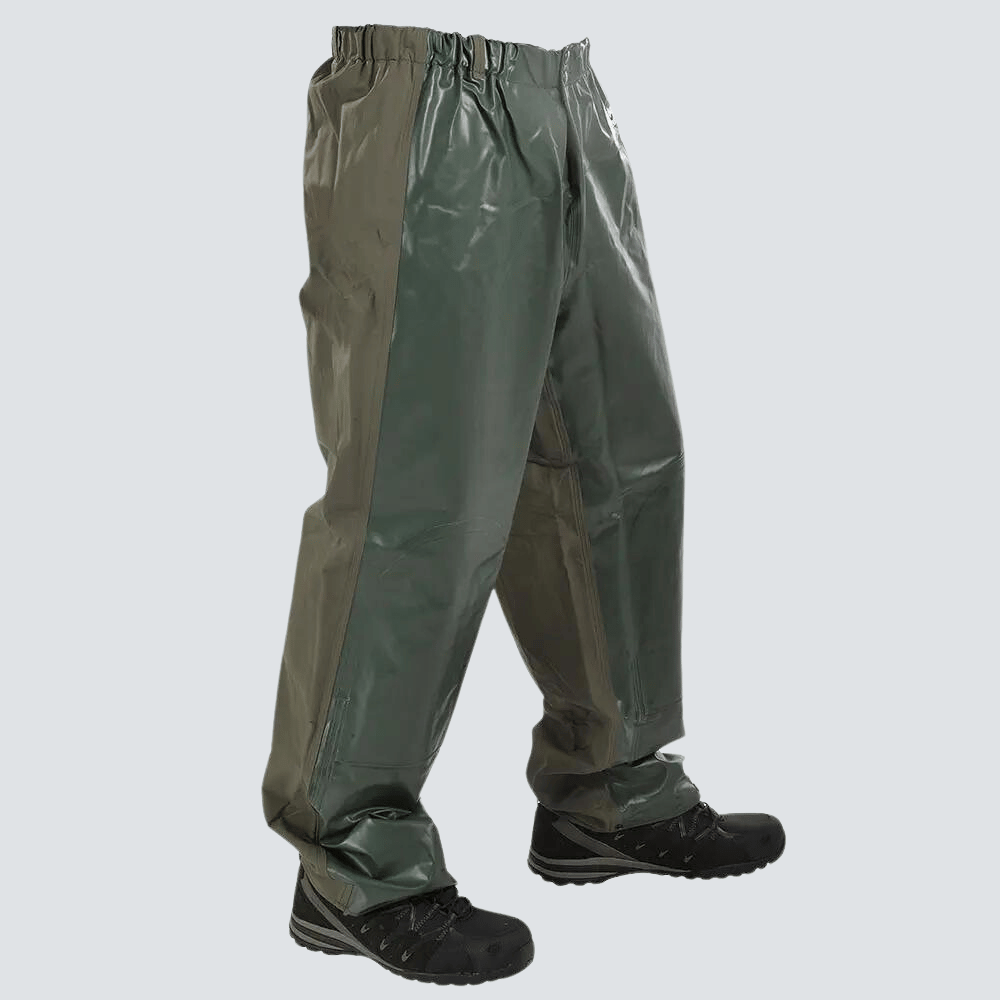 Strapazierfähiges PVC-Material: Die Regenhose ist aus strapazierfähigem PVC-Material gefertigt, das für seine Widerstandsfähigkeit gegen Abrieb und äußere Einflüsse bekannt ist.
