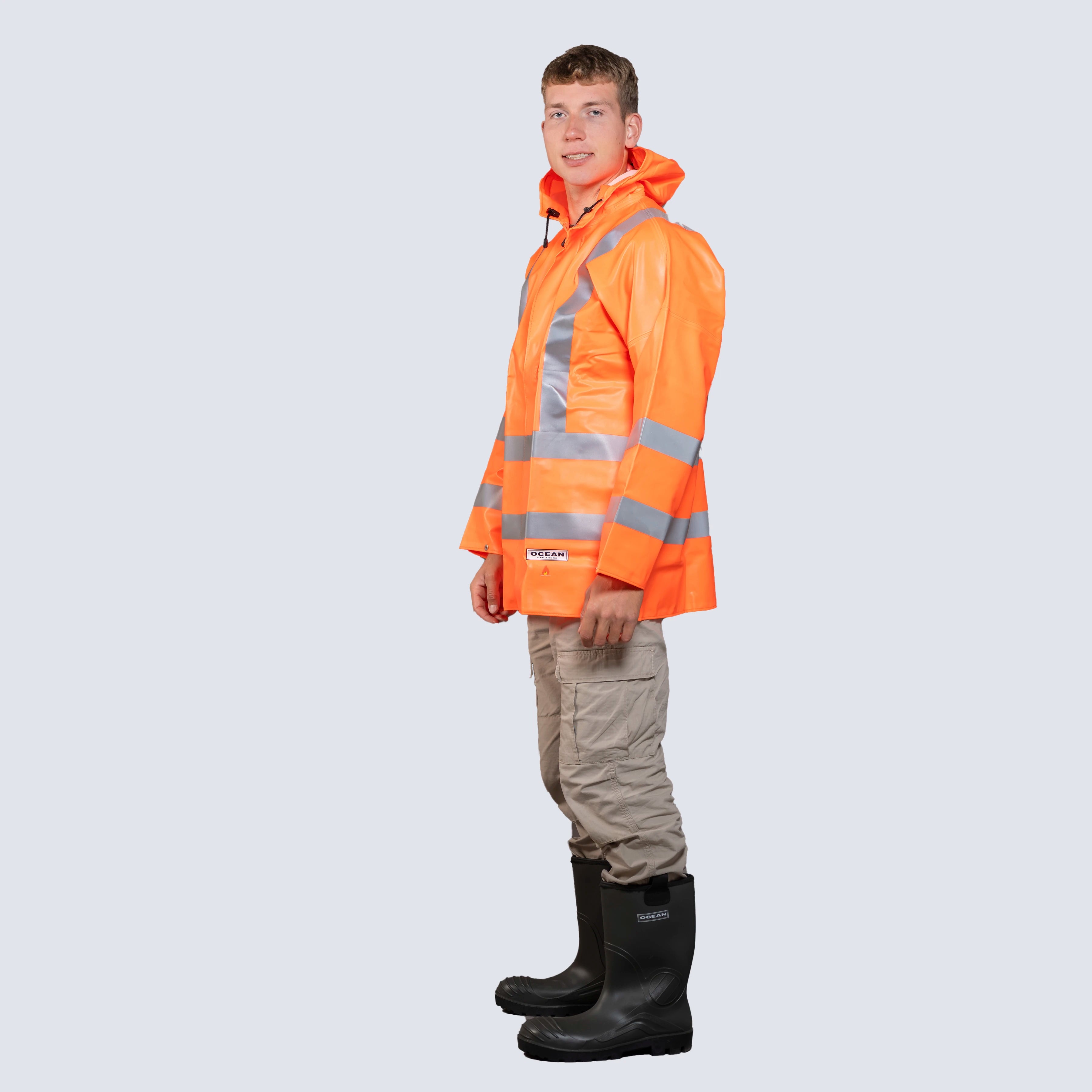 Offshore Pro High-Vis the jacket from OCEAN is a rain jacket that is flame retardant and resistant to grease and oil. It is made of a flexible and cold-resistant PVC material. The jacket closes with a zipper that also has buttons and a front placket. It has a loose-fitting comfort hood with a drawcord inside for adjustment and sleeves with press studs to regulate sleeve width. This work rain jacket is a High-Vis jacket, which means it is equipped with several reflectors to ensure high visibility.