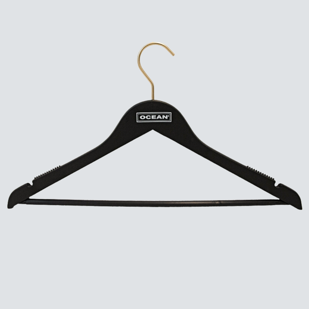 OCEAN buksehenger i tre av høy kvalitet med tverrstang. Matt svart med metallkrok. Mål 44 cm.
